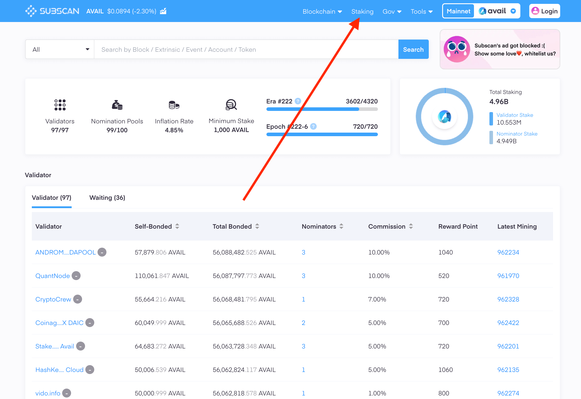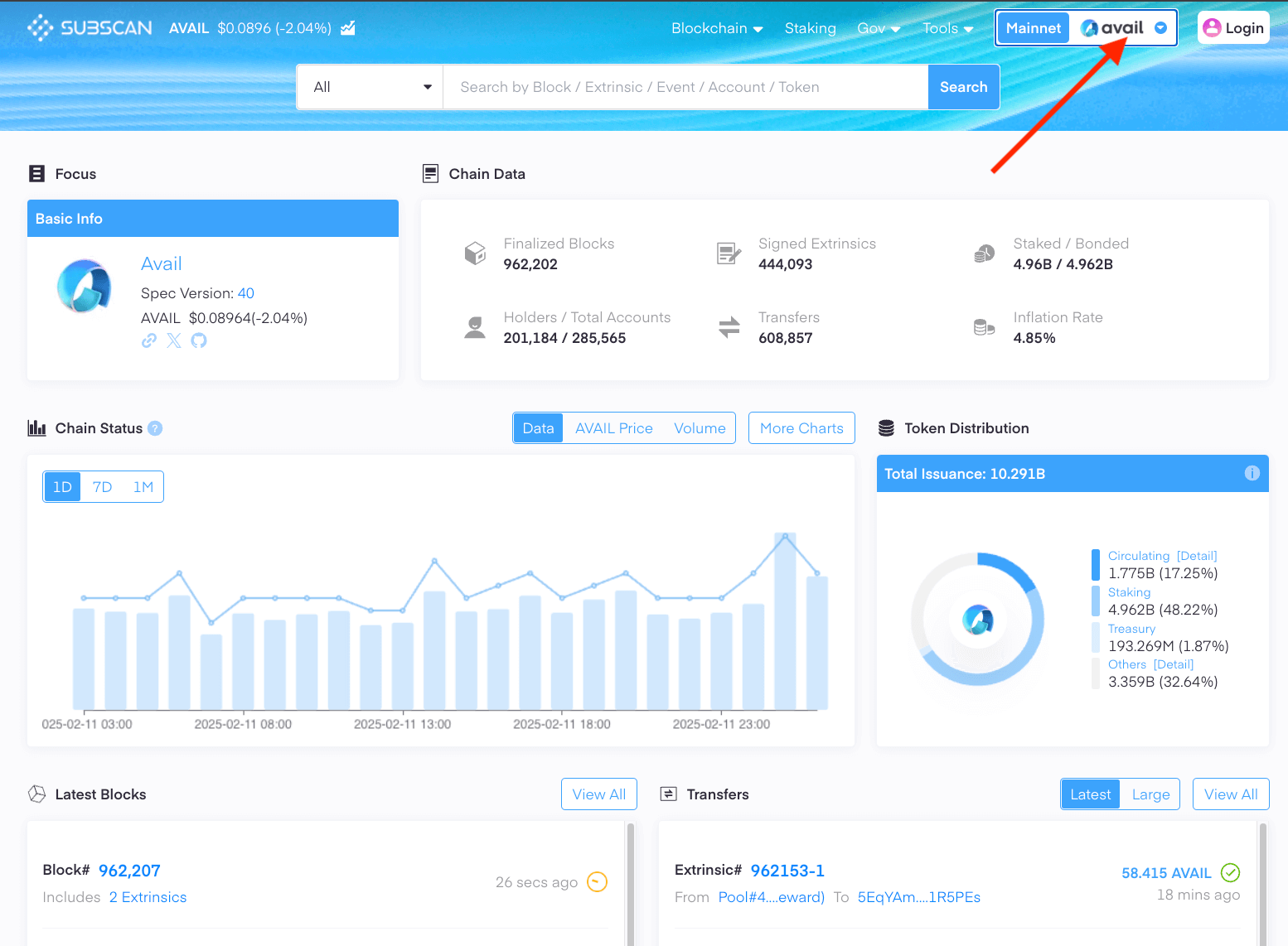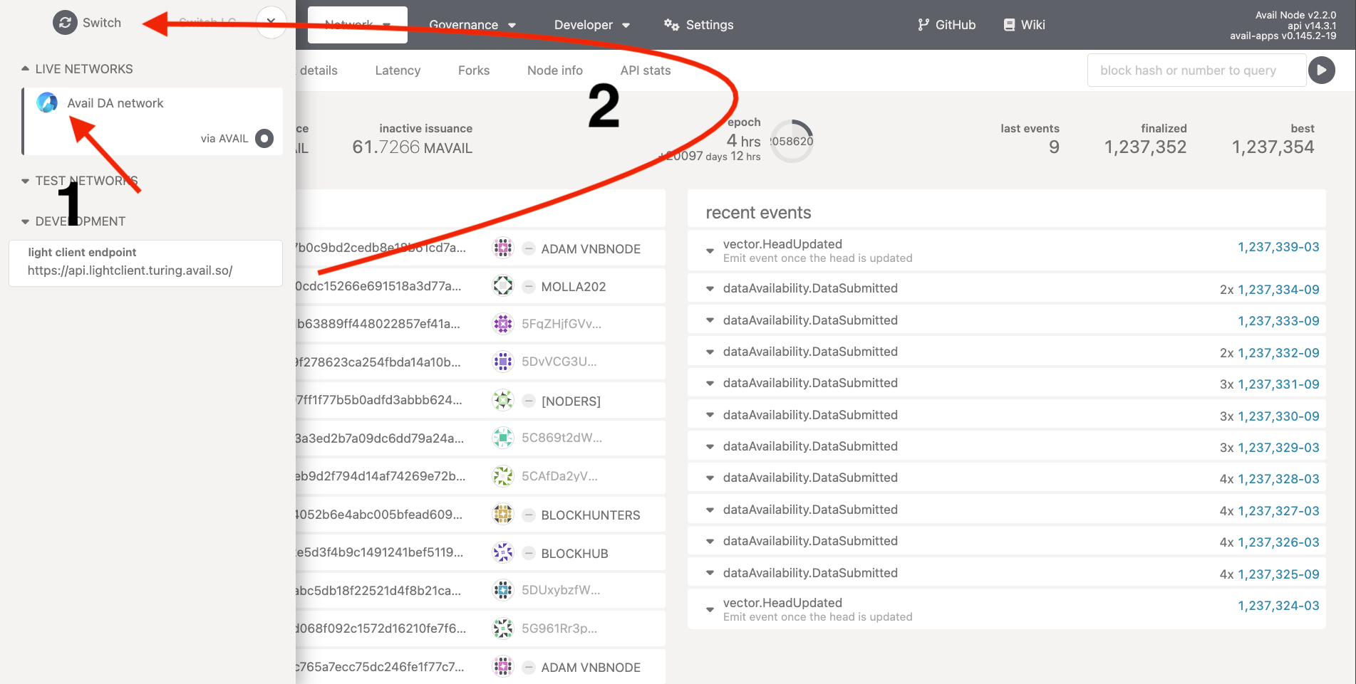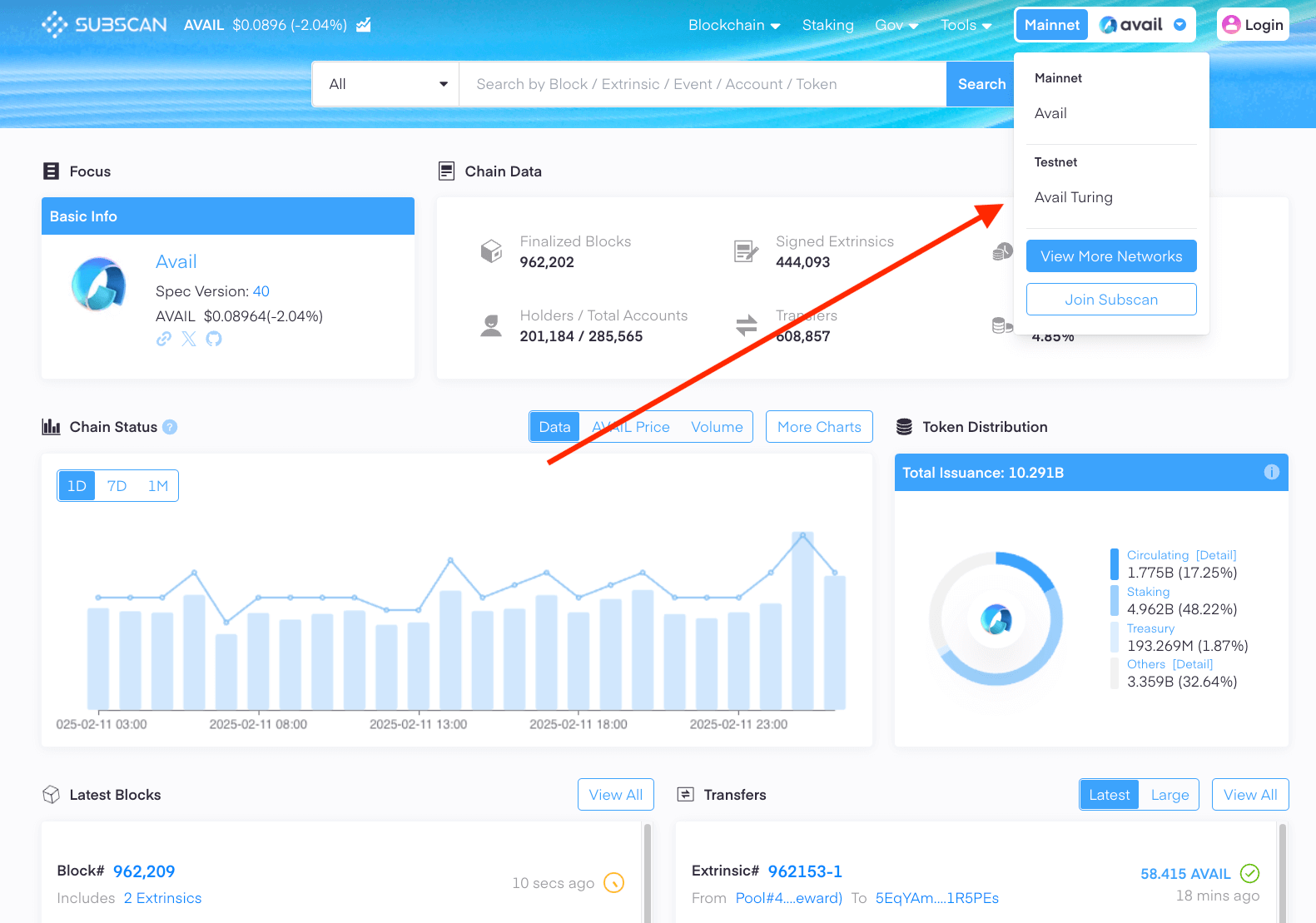 1. Depending on the network you are on, click on live networks -> Avail DA network, or test network -> Avail Turing testnet.