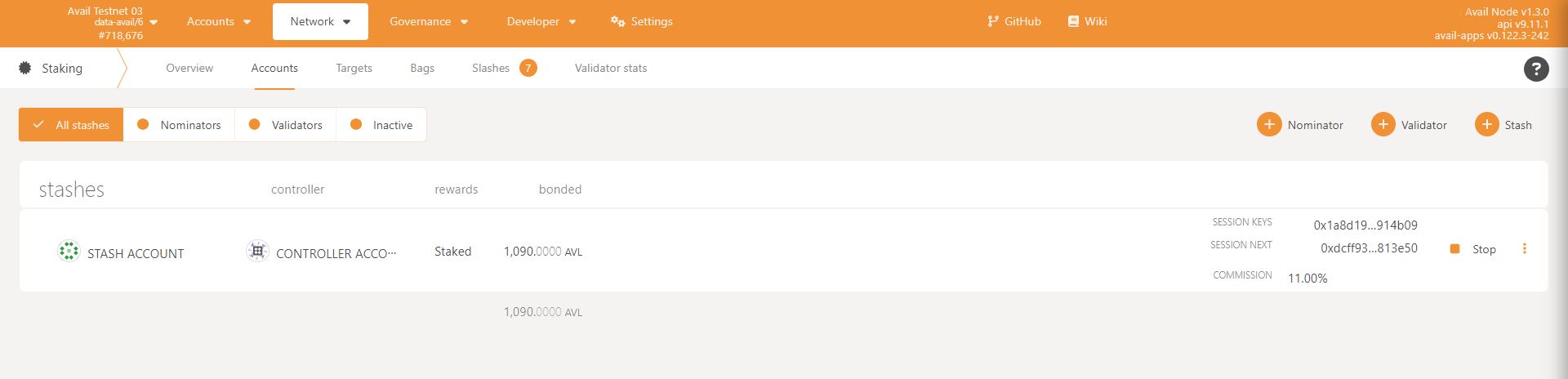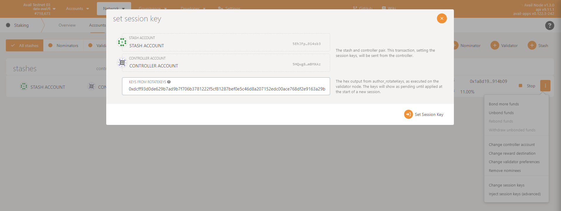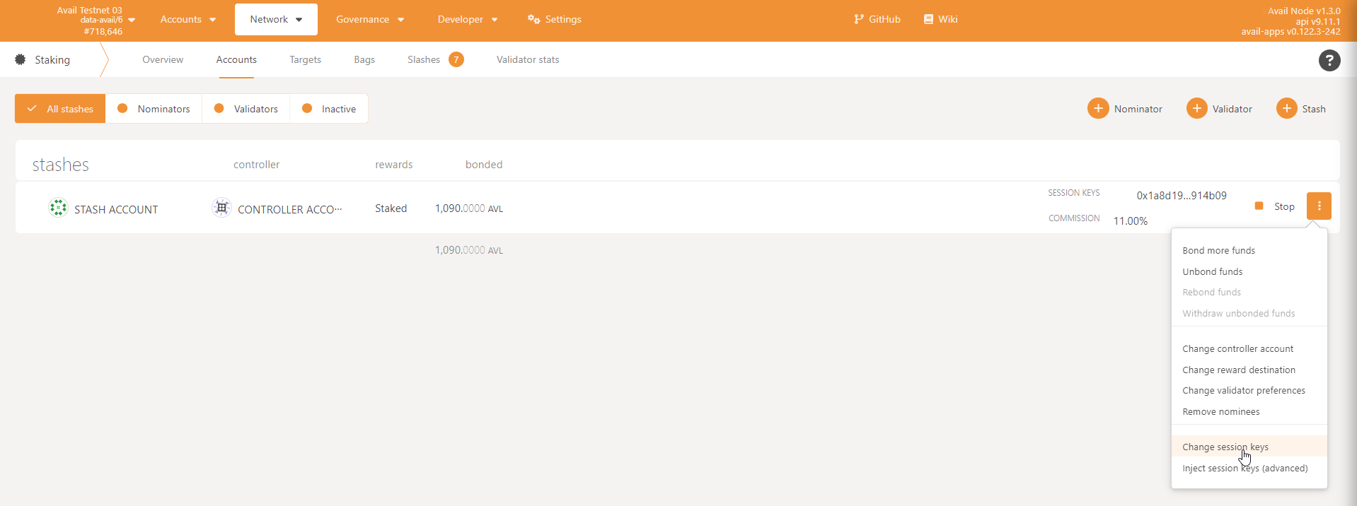 • Open Avail Apps and navigate to Network → Staking. You will be able to select from a hidden menu the option to change session keys.