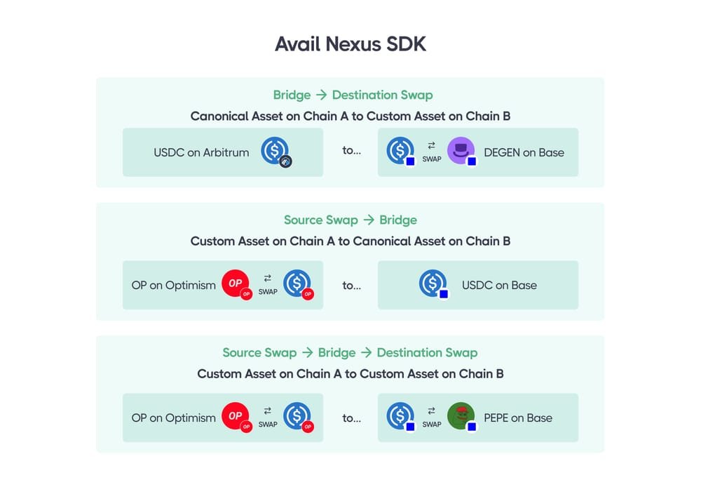 Avail Nexus SDK automatically manages the entire transaction lifecycle. It analyses and suggests the optimal routing path to fulfill the user’s intent, resulting in an ‘any token in’, ‘any token out’ effect.