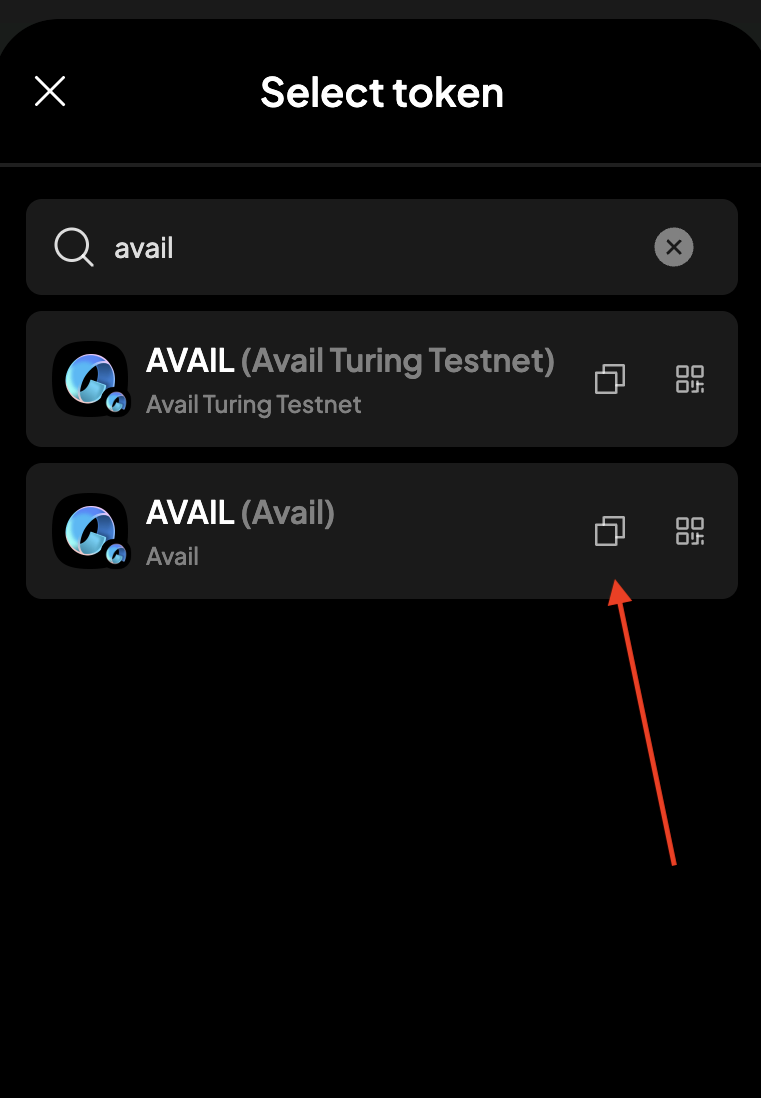 Get addressbutton. Again, search for Avail testnets by name or token symbol, and click on thecopy addressbutton.