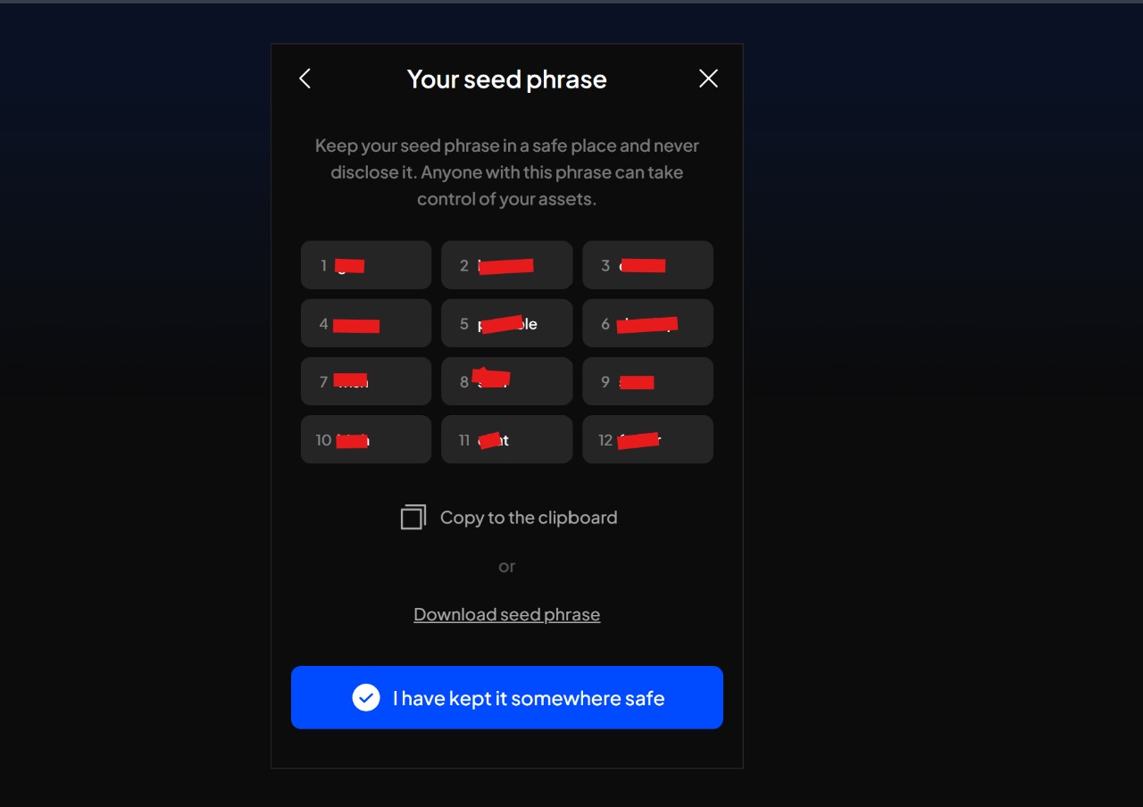 NEVER EVER share your seed phrase with anyone and keep it in a secure location. Anyone with access to your seed phrase can gain control of your account.
