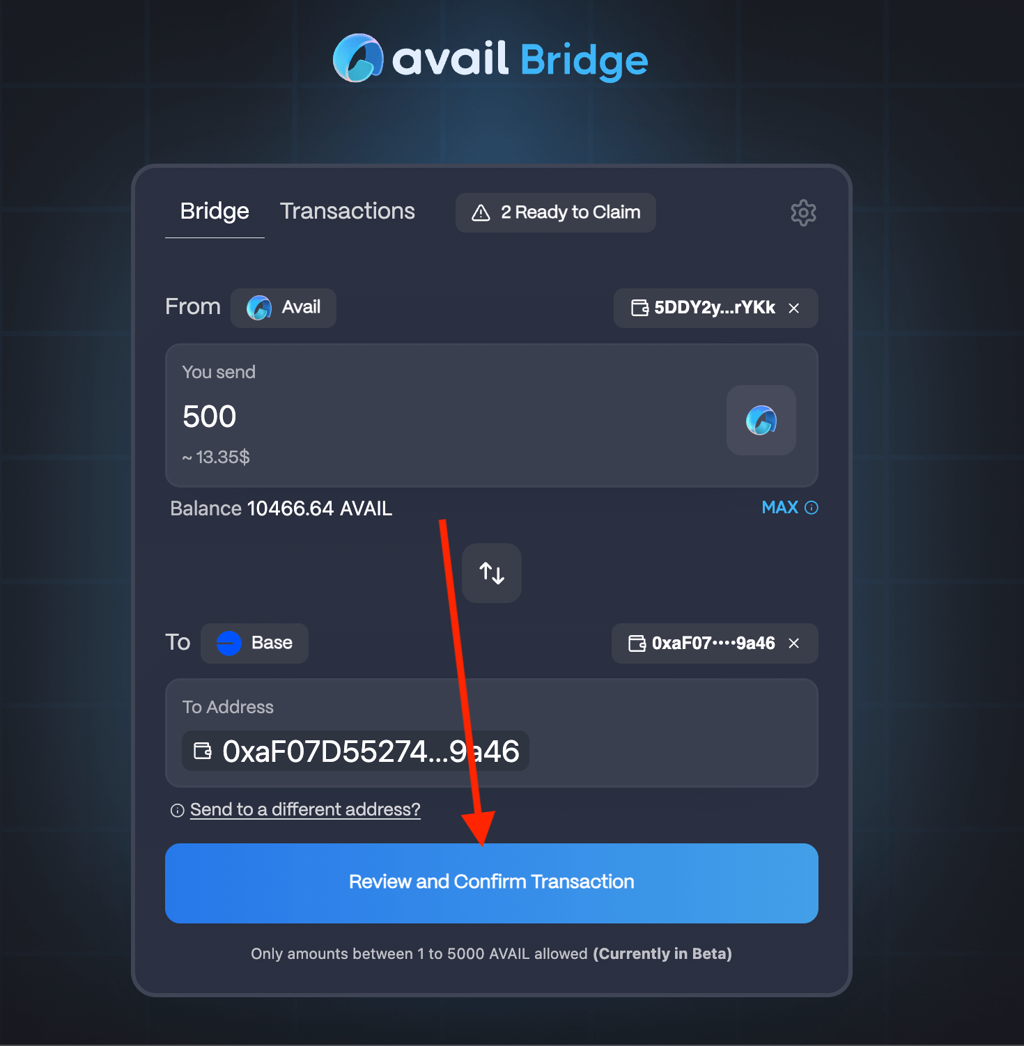 The bridging process between Avail & Base takes around 5 minutes and the funds are sent automatically to the user on the destination chain.