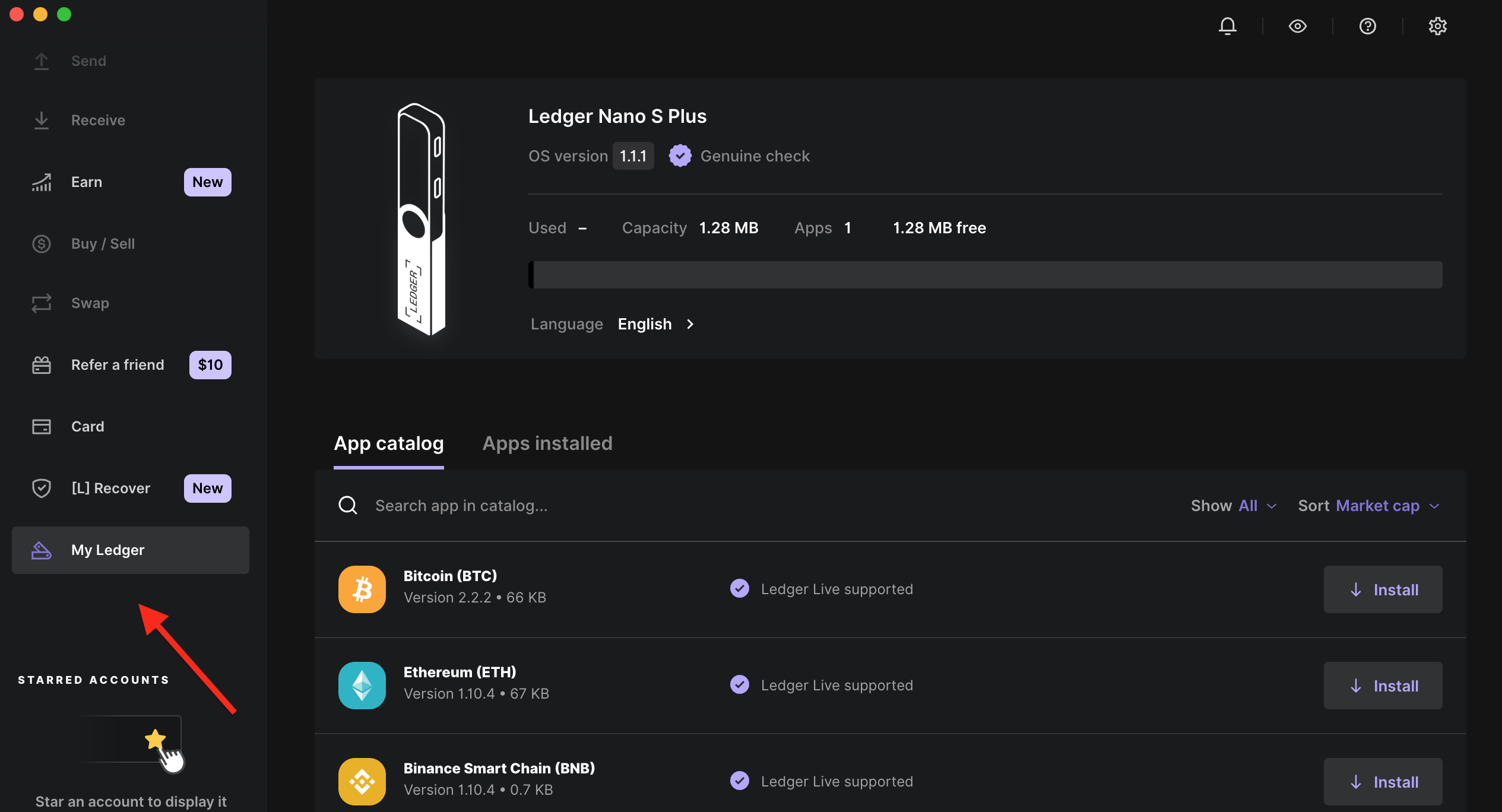 1. Open the Ledger live app and naviagte to the ‘My Ledger’ tab from the sidebar.