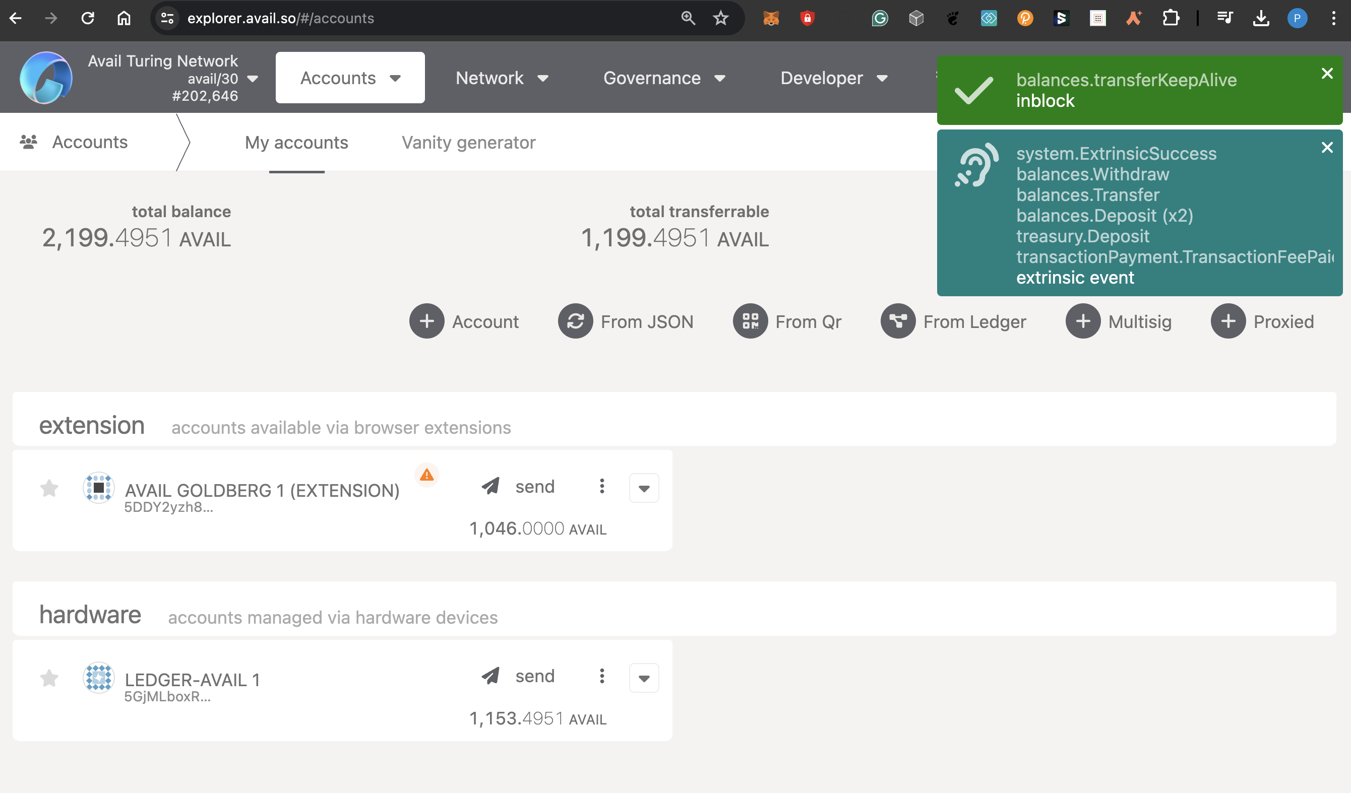 If you face any issues while using your ledger device with Avail DA, please feel free to reach out to us on our Telegram  or Discord .